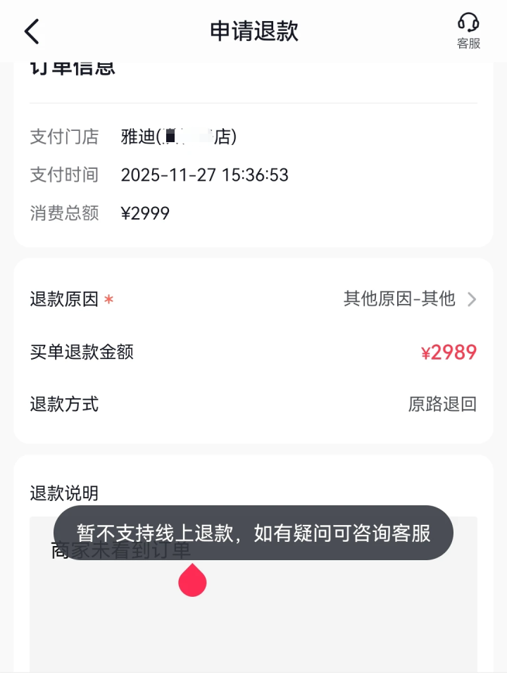 李承海在线下雅迪店铺买电动车,用抖音买单付了2999元,商家说没有收到钱,询问雅迪那边说他们公司线上没有收到钱,申请退款还不支持线上,只能找抖音人工客服,三天后这笔钱才被退回来。